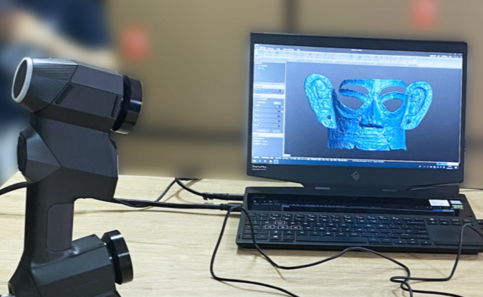 ▲使用智能手持式藍色激光掃描儀掃描寬1.38m的青銅大面具