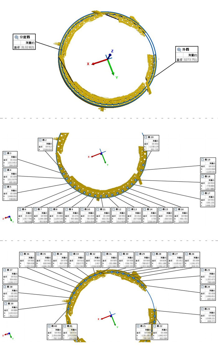 客戶為西南某制造企業,有一圓柱形工件(直徑3m),因已使用一定年限而有所磨損,客戶需要采集該工件數據,獲取外徑、所有孔位尺寸及小孔分度圓等關鍵尺寸,判斷偏差是否在容差范圍內,同時用于安裝在該工件上的配套工件的逆向設計。