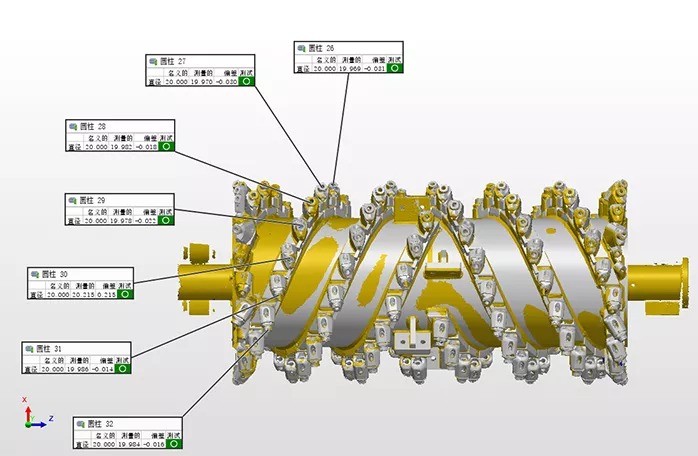 銑刨鼓是道路銑刨機的核心,需經過嚴格的檢測,以避免磨損以及變形的負荷縮短設備使用壽命。過去采用接觸式打點來進行檢測,不但測量速度慢,而且測量死角多,測量數據不全,且銑刨鼓的刀頭為活動刀頭,裝配后測量無法測得準確的刀頭點位。