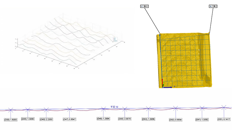 ◎掃描輸出的三維模型直接導入到Geomagic Control檢測軟件中進行分析,圖中是以一個水平面為參考,計算出的最大上偏差及最大下偏差,可以由此分析路面的形貌高差。